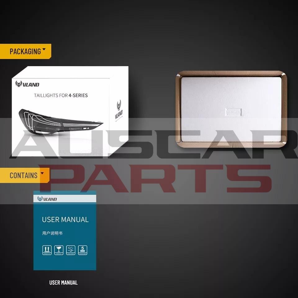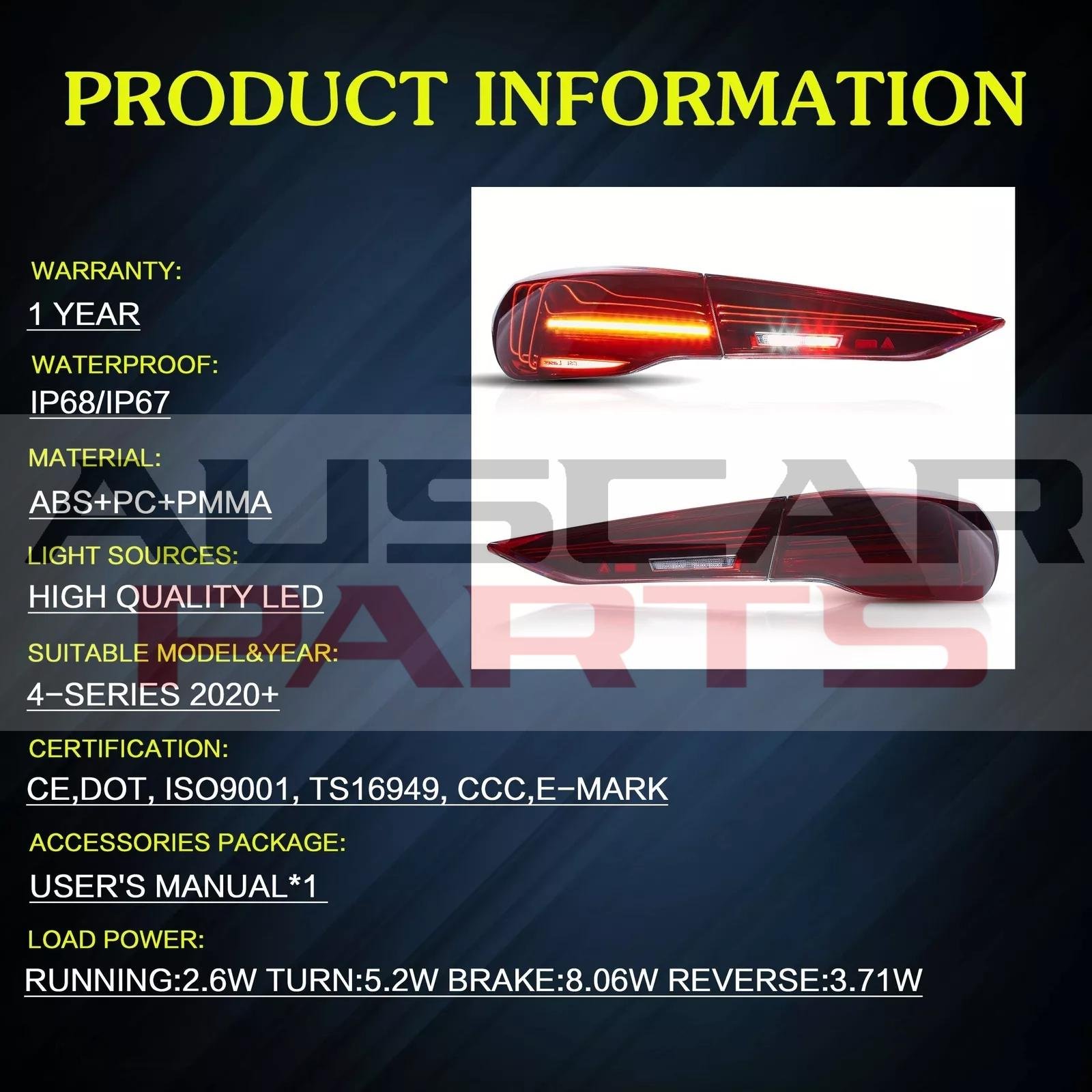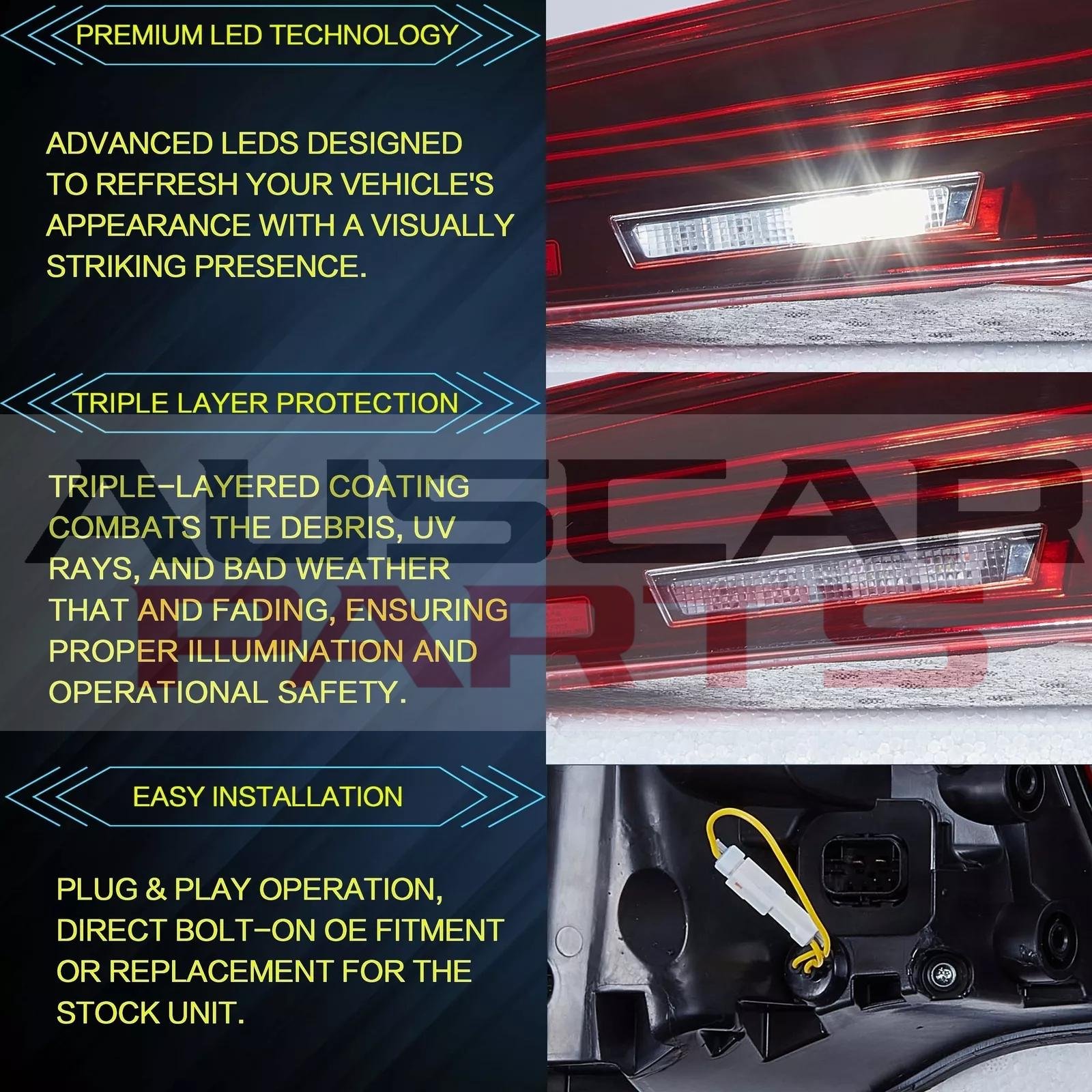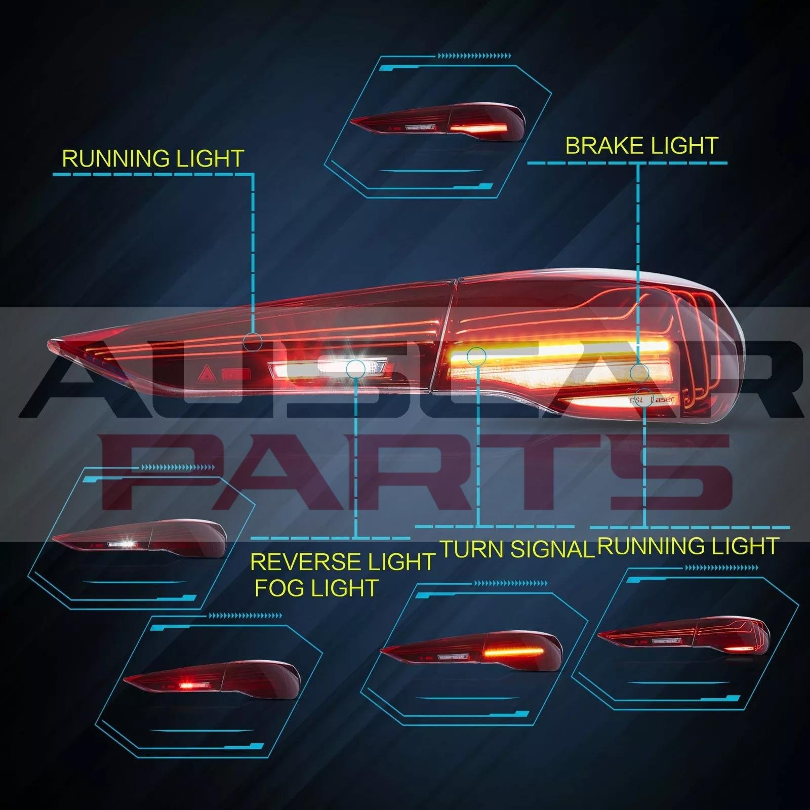 LED start animated running lights , LED brake lights , LED sequential turn signals , LED reverse lights , LED fog lights