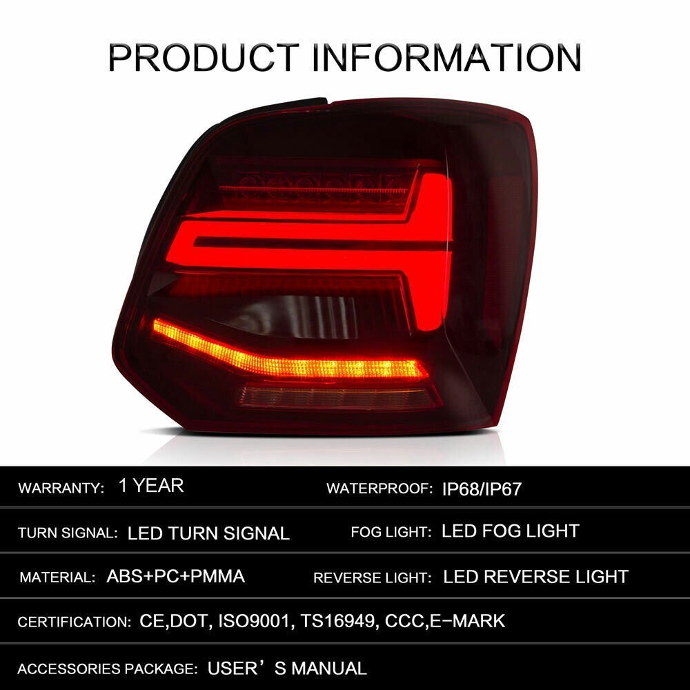 - Direct OEM Fitment – VLAND LED taillight assembly for 09-17 Volkswagen Polo 5th Gen (LWB/SWB) With Stock Halogen Tail Lights. Designed as a perfect replacement for your OE lights, they install the same way as factory units.